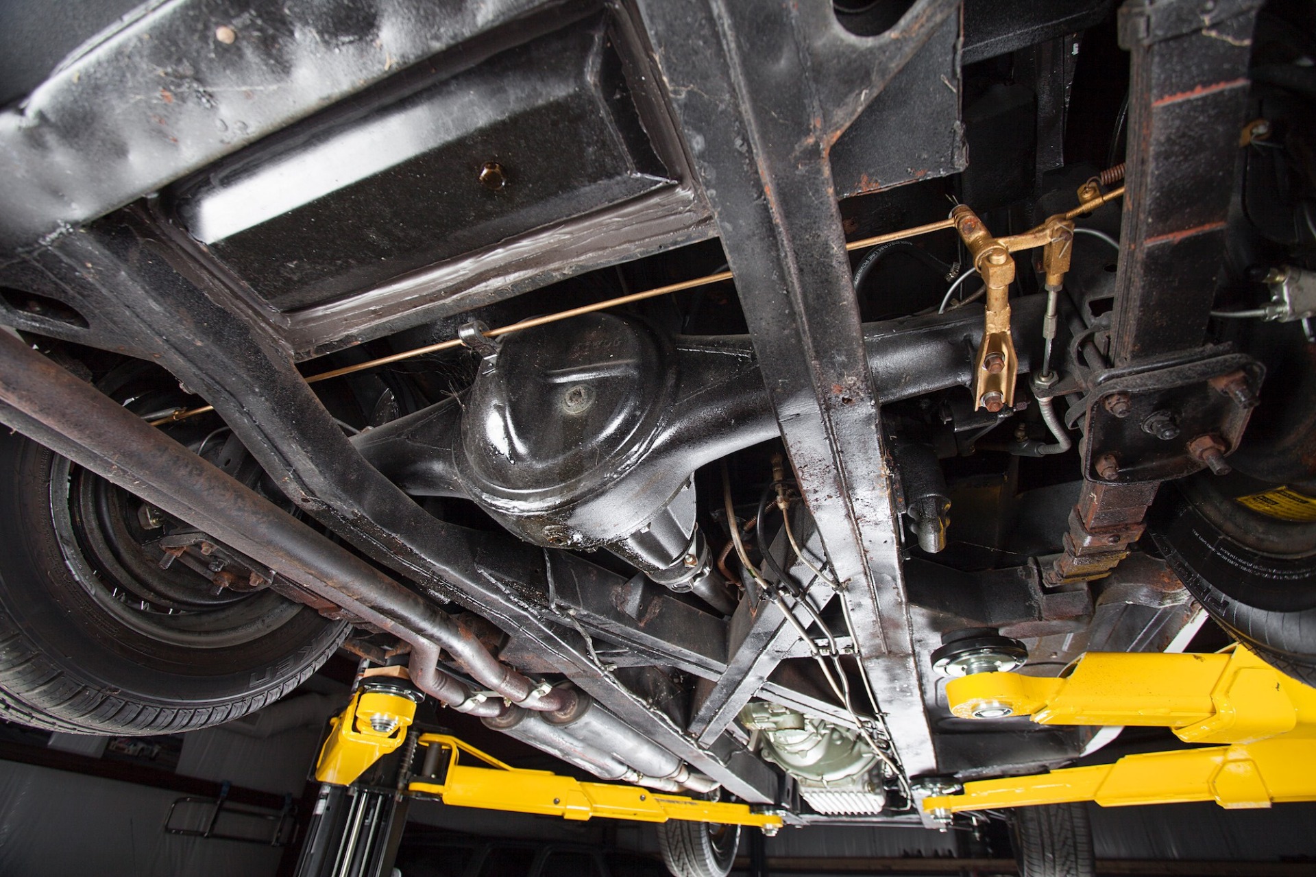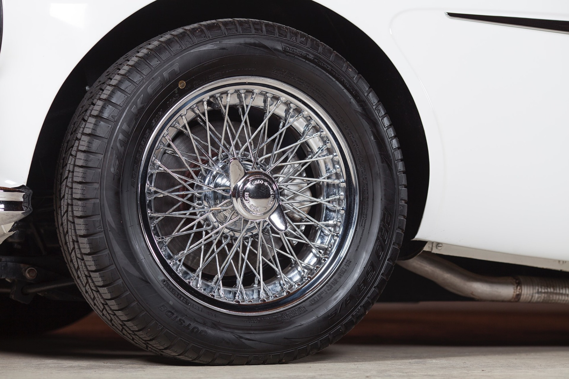 The 15″ wire wheels are secured with knock-off spinners and wear 205/50-15