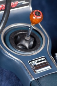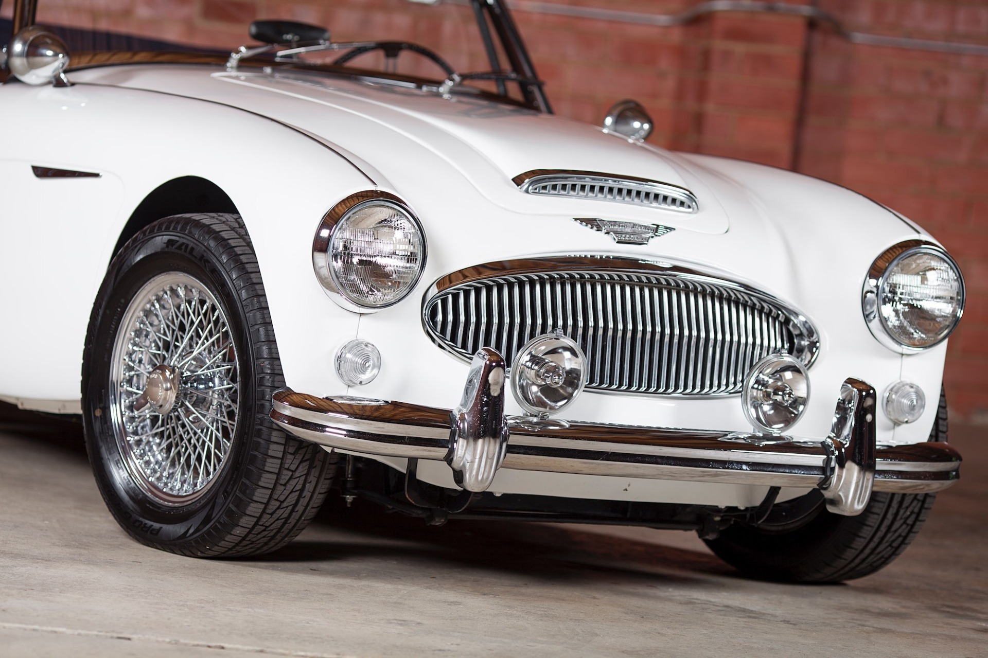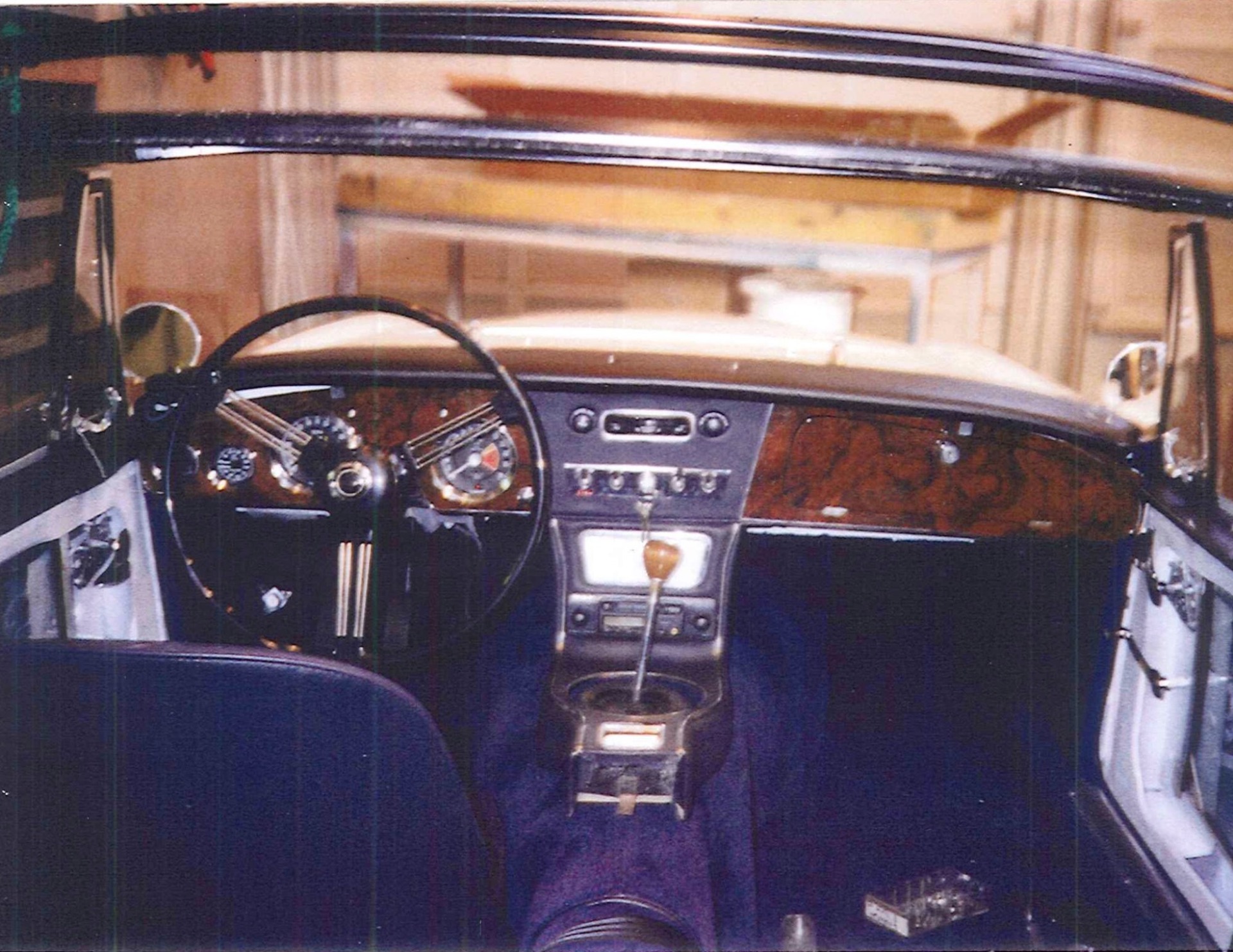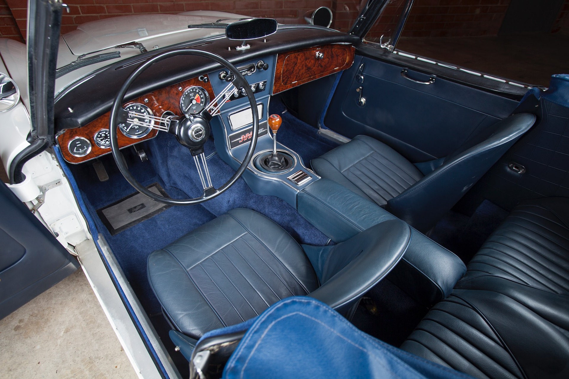 steering wheel, a Healey-branded wood shift knob, and wood dash veneers. Per