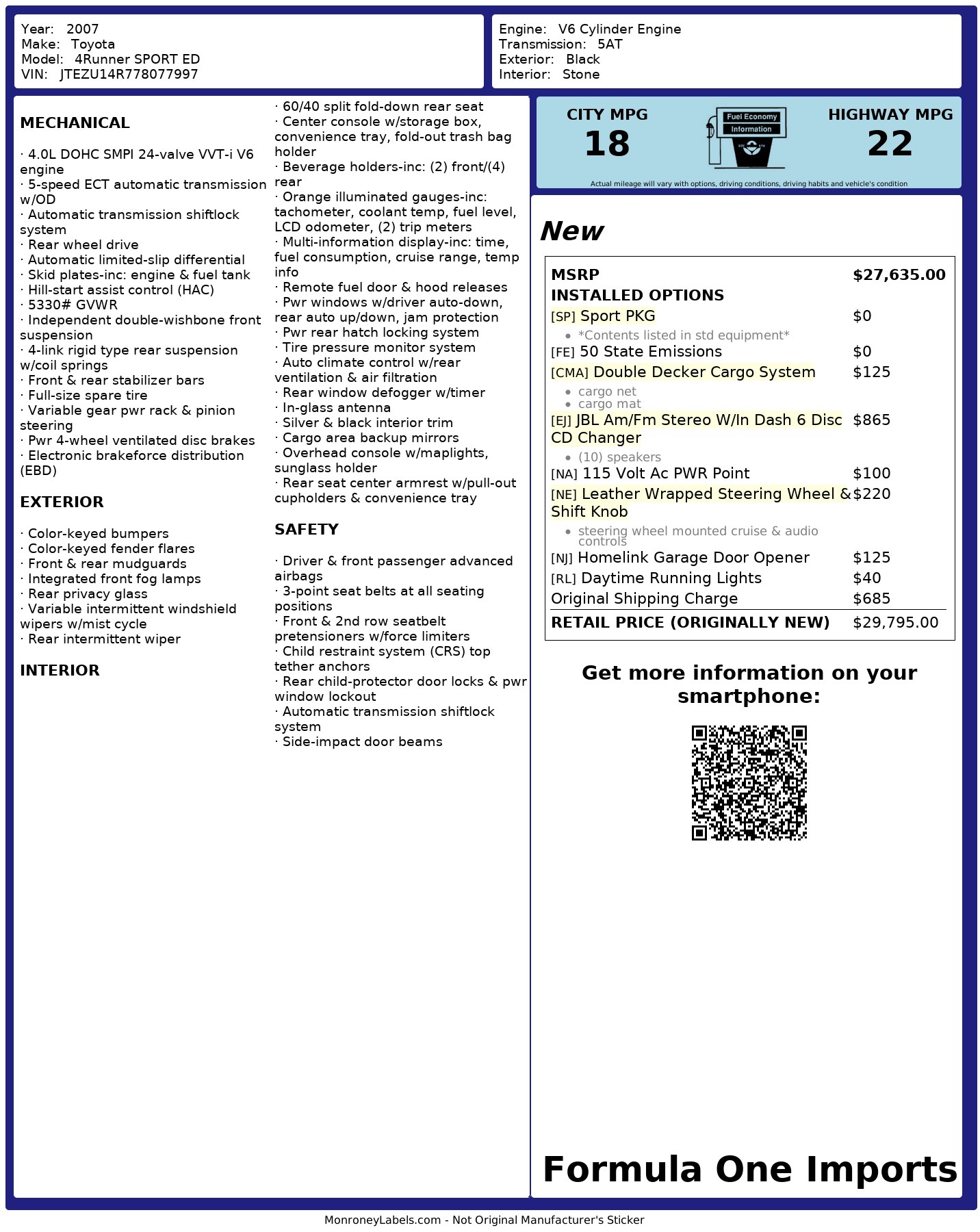Used 2007 Toyota 4RUNNER SR5 SPORT EDITION / 4.0L V6 / 5-SPD AUTO / JBL AUDIO / HOMELINK